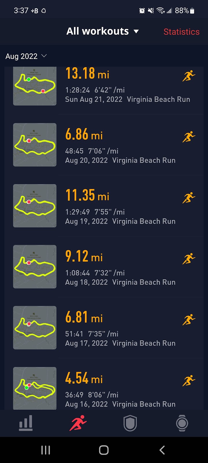 Well I have officially lost 2 toenails. One on Friday and another on Saturday. Nothing painful or really even noticeable but was concerning as I had never lost one and was not sure how it would affect my running. Friday August 26th I had a good training session. The picture shows that the pace was way slower than usual but there is a reason behind this. I had put on a kit (15lbs) and a ruck (45lbs) for a total of 60lbs of weight. I was running with a guy from work and we ran about 4 miles with the 60lbs on (and by ran I mean slowly jogged and power walked to keep a decent pace). Of that 4 miles about 1-1.5 of it was soft sand at the beach as we caught high tide and were stuck between a mixture of sinking into soft sand with 60lbs of weight on or getting hit with the waves as they came in. We both were soaked. After about 4 miles with the 60lbs on we dropped the ruck and continued to run with the kit on to the obstacle course, complete it, and ran back. When we finished I took my sand covered shoes and socks off and realized I was missing a toenail. It had been blacked since Old Dominion 100 and I guess it was just time to let it go. The next day I was casually walking up my stairs in the house and just lightly caught my foot on the stairs and broke another toenail off the other foot off. Luckily only having 8 toenails left has not stopped me from running. The past 2 days have just been longer steady state runs. I was sore from the weighted runs but still wanted to get some distance in. I think next week I will go for a longer run as my last long run prior to the race.